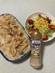 鶏肉マカロニグラタンと野菜サラダ(レタスきゅうりトマトコーンサラダ豆)作りました。