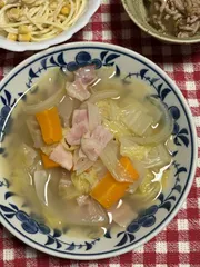 白菜とベーコンのスープ 昨日の夕食に白菜のスープを作りました。白菜があと少し残っていたので使い切り、玉ねぎ🧅、にんじん🥕、ベーコン🥓も刻んでマヨソテー。塩コショウ、コンソメで煮込みました。あとは前日に沢山作ったパスタサラダ🥗と煮物少々。腹八分でご馳走様でした🙏