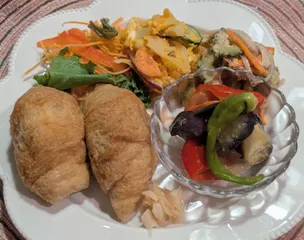 サラダクラブさんの【ケールが入った7品目の緑黄色野菜サラダ】【坊っちゃんかぼちゃのサラダ】【ゴーヤサラダ】【炊き込みちらしのおいなりさん】【しょうがの甘酢漬け】【長茄子とパプリカと万願寺とうがらしの黒酢あんかけ】