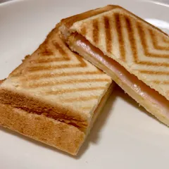 ハムチーズマヨのホットサンド 簡単で美味しいので朝食にもランチにもおやつにもお勧めホットサンド🍞コレは1番お気に入りのハムチーズにマヨネーズ(好きなだけ)😋具はポテサラでもBLTでも💗
