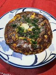 お休みのおそい朝食に"スパニッシュオムレツ🥘"作りました。残り物の🍄佃煮➕ウインナー➕レンチン🥔を3個の溶き卵に混ぜてバターで焼きあげました♪ 3個の溶き卵には…牛乳、オリゴ糖、🟥キャップキユーピーマヨネーズ大さじ2が入っています。弱火で焼いたつもりが… 焼きすぎました😢