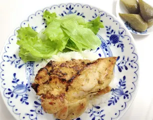 鶏むね肉にマヨネーズまぶしつけこみ、赤唐辛子•ナンプラー•カレー粉•塩胡椒•砂糖•胡麻油•他すり混ぜたものを、さらにまぶしてつけこみソテーしてご飯にのせ美味しく頂きました。🌻