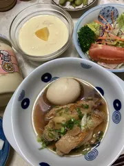 昨日の夕飯に作りました。鶏手羽中をマヨで炒めてから煮ました。上の器はデザートのマンゴープリンです。甘さ控えめに作りました😅