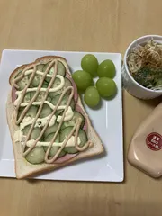 朝ご飯。 パン一枚しか無かったからオープンサンド。相変わらず映ないグリーンパーティー(笑) パンに辛子マヨネーズ塗ってハム、グリーンカーテンのきゅうり、キューピーハーフと、BBQマヨ。 サラダはインド料理屋さんで食べたサラダにはまってます! いつもは赤フレンチドレッシングにクミン