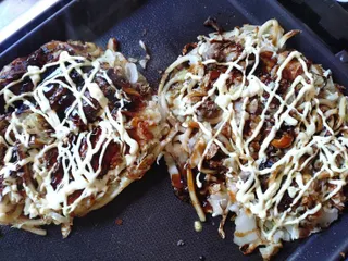 ホットプレートでお好み焼きを作りました。たっぷりマヨネーズをかけて美味しくなりました😋