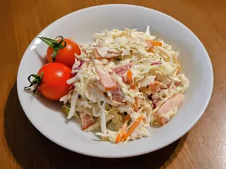 ベーコン入りコールスローサラダ ベーコン入りコールスローサラダの、オレガノ&シナモン風味。 手作りコールスローのソースにオレガノ、シナモン、ベーコンを投入しばらく置いて、ソースに風味が着いたら野菜と混ぜ込んで完成。ベーコンのスモーキー感を狙ったけど、オレガノの香りが強かったか?でも家族からは👍をもらいました。ほんのり来る