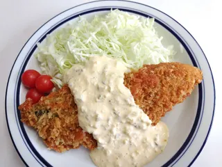 白身魚のフライにかけることが多いです。 材料は 卵にマヨネーズ、水にさらした玉ねぎ、こしょう、みじん切りのパセリ をパラパラとかけると色が綺麗です。