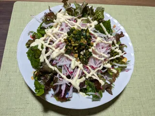 サニーレタス、サンチュ、大根のサラダにキユーピーハーフと深煎りごまドレッシング🥗かつお節もパラパラと😋