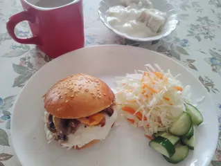 目玉焼きバーガー 目玉焼きのハンバーガー🍔です😅キャベツとマッシュルームも、挟みました。