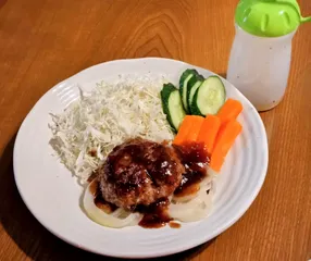 手作りハンバーグ! 家族からギュッとした肉のハンバーグ…とのリクエストがあったので、今日はハンバーグ。いつもはつなぎにパン粉、卵を使いますが、今回はマヨネーズのみ。あと混ぜたのは塩コショウ、クローブ、ナツメグ、クミン、シナモンのスパイス。ニンジンはグラッセにしないで茹でただけです。両面焼いたら、サイズがギュッと小さくな