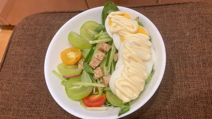 サラダにはマヨ!⑤ いただいたシャインマスカットも入れて(^-^)v とても美味しかった〜⭐︎