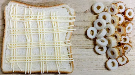 チクワをカットして、パンにマヨひいて、チクワを乗せて、マスタードとシラチャーたらして、トーストして、サンド‼️