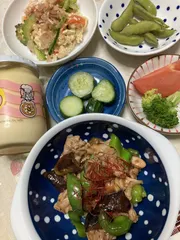 昨日の夕飯です。 豚こま・ピーマン・茄子の炒め物とゴーヤチャンプルーです。 両方とも炒める時にマヨを使いました。
