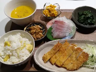 今年初の栗ご飯です✨剥くのは大変でしたが、美味しく炊けたのでよかったです😊 栗ご飯とんかつヒラスお刺身モロヘイヤのごま和え切り干し大根のハリハリ漬けかぼちゃサラダかぼちゃスープ