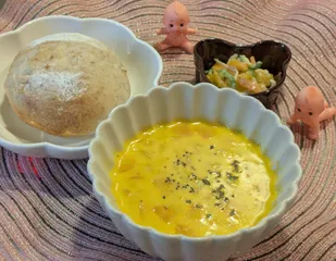 公式さんの【かぼちゃとベーコンのかんたんポタージュ】※にんじんをプラスしました🥕【サラダクラブ 北海道コーン入り自家栽培巨峰酵母のコーンパン】※フランスパン粉が無くて強力粉と全粒粉で作りました。【コールスローサラダ】 ポタージュスープ簡単に作れて美味しかったです💗