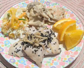 【コールスローサラダ】『熟れたゴーヤ』『キャベツ』『にんじん』『たまねぎ』『こどもピーマン』【湯葉と舞茸の煮浸し】【れんこんとごぼうとにんじんの酢味噌和え】【黒酢たまねぎでまぐろのしょうが焼き】【オレンジ】