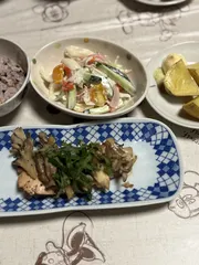 秋鮭と舞茸のレンジ蒸しとカニカマサラダ