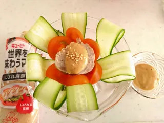 ミックさん バンバンジー風、盛り付けが綺麗ですね❗️ 世界を味わうマヨと深煎りごまドレッシングをあわせたお味が気になります😅