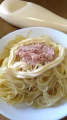 ひとりぼっちのお昼。茹でたパスタに、ツナ缶のせてマヨネーズぶにゅーっと掛けて完成。塩コショウしたり、白だしかけたりと味変も自由自在な万能&手抜きまくりのランチです。安定した美味しさ。マヨネーズ凄いなぁ