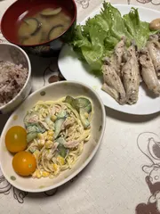 手羽中の塩麹マヨ焼きとパスタサラダ 昨日の夕飯は手羽中の塩麹マヨ焼きとパスタサラダを作りました。マヨ焼きはポリ袋に塩麹とマヨを入れて混ぜそこに手羽中を入れ揉み込みオーブンで蒸し焼きにしました。思ったより焼き色は付きませんでしたが、プルッとした食感で骨離れも良く美味しく頂きました。パスタサラダにはパスタ、ツナ、キュウリ🥒、コーン🌽を入れ