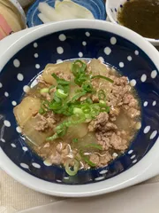 そぼろ大根のとろとろ煮を作りました。豚ひき肉をマヨと胡麻油で炒めてからレンチンした大根と煮ました。