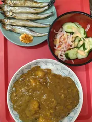 焼きシシャモに七味マヨ、カレーライスとサラダをいただきます(*^^*)