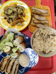 ごま油でナスと紅生姜天を炒めた仕上げにマヨネーズと醤油を加えました。しめじの炊き込みご飯、ちくわのキュウリチーズ巻、海老餃子、煮玉子、豚トロ焼きを今からいただきます(*^^*)