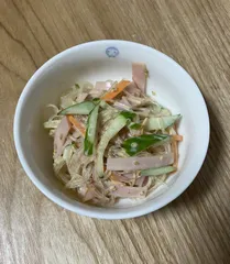 春雨サラダ きゅうり、ハム、にんじんが具材の春雨サラダを作りました。マヨネーズとゴマドレッシングで味付けして、最後に白ゴマを入れました。