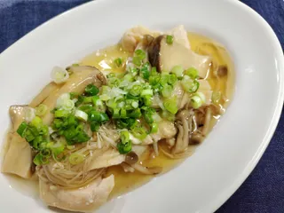 鶏むね肉(塩•コショウ•マヨネーズ•酒)レンチンし、きのこのあんかけ作り小ねぎトッピングして美味しく頂きました。🌻