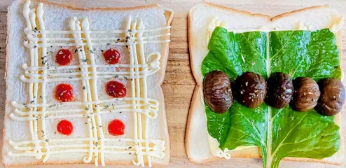 クククッ、栗サンド🌰 マヨ上の葉っぱに甘栗乗せてサンドウィッチしてみた…食べづらかった…🙄