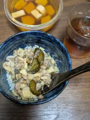 漬物納豆マヨごはん。山芋、きゅうりの古漬け、チーズ刻んで醤油マヨで和えてのっけただけの簡単飯。