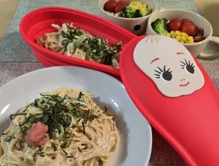 先日メンバーさんが作られていた🍝たらこクリームパスタを見て作ってみたくて作りました🎽ずっと眠っていた😪たらこキューピーのシリコンスチーマーを使ってパスタを茹で、ソースはフライパンで牛乳、めんつゆ、マヨネーズ、バター、たらこを入れて作りました🍝手際が悪いため少し固まってしまいましたが💦味の方はなんとか