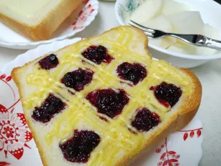 ジャムマヨトースト(ブルーベリー) 朝食◯食パンにブルーベリージャム+マヨネーズをかけてトーストしました ◯梨 ◯コーヒー