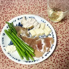 手抜きおつまみプレート アスパラをゆでて、あとは適当に切って盛り付けただけのおつまみプレート。アリオリマヨがアクセントです。これでずっと、ワイン飲めます❣️