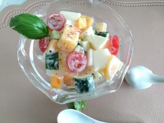 角切りした大根、きゅうり、リンゴ、柿、ミニトマトをマヨネーズと芳醇リッシュフェルメンテ塩コショウとあわせ仕上げにブラックペッパー、家庭菜園のバジルを添えました 程よい酸味と芳醇な香りがさっぱりさわやかにしてくれブラックペッパーのアクセントが美味しくいただけます