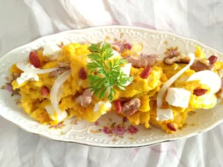 レンチンしたかぼちゃにマヨネーズと塩コショウ スライスしたたまねぎとクリームチーズ、乾煎りしたくるみとクコの実をトッピングしていただきました いつもはかぼちゃを茹でて作っていましたがレンチンのほうが水っぽくなくホクホクです 香ばしい胡桃と甘いクコの実がいいアクセントです
