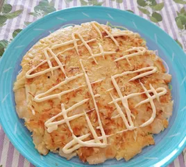 キャベツ、お餅にチーズ、残ってたはんぺんを入れて焼きました。フワフワカリカリもっちりで思った以上に美味しく出来ました。マヨは欠かせません。今度は何を追加してみようかな♪
