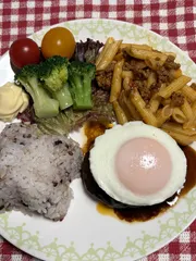 昨日の夕飯はちょっと手抜き😅 昨夜はハンバーグ。でもレトルト😅使い。目玉焼き🍳を乗せちょっと豪華に。野菜にマヨを添え、前日作って小分けにしてあったミートソースをペンネと和え付け合わせにしました。