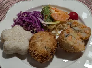 【鮭コロッケ】『じゃがいも』『たまねぎ』『にんじん』『れんこん』『甘塩鮭』『ピザ用チーズ』『マヨネーズ』【キャベツのピクルス】【スパゲティサラダ】『スパゲティ』『たまねぎ』『にんじん』『絹さや』『ロースハム』『ゆでたまご』『りんご酢』『はちみつ』『マヨネーズ』【ミニトマト】【七分搗きご飯】【かぼちゃ