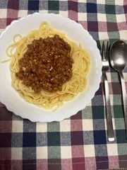 ミートソースパスタ 超久しぶりにミートソースを作りました。あらかじめ合挽き肉をマヨでよく炒めておきます。キャセロールに炒めた合挽き肉、レンチンしておいた玉ねぎ、刻みニンニク、カットトマト🍅、ベーコン🥓のみじん切り、塩コショウ、ケチャップ、コンソメスープ、ローリエなどを入れ混ぜ蓋をしてレンジで30分程煮込みました。途中一