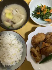 旦那リクエスト‥何食べたい?肉‥。豚焼肉かから揚げの2択にしたら、から揚げ‼️って事でにんにく🧄たくさんのから揚げを作りました。マヨも添えて‥今見たらマヨが写っていませんー😳マヨー多分見切れた部分に居るのね。。 エビフライ‥から揚げと投稿してますが、2日連続ではありません(笑)