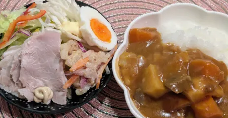 ロースハムを作りました🥩 ◆昨日の夕食◆【カレーライス】【野菜サラダ】 ◆今朝の朝食◆【ベーグルサンド】『自家栽培シャインマスカット酵母 ベーグル』『レタス』『ゆでたまごのタルタルソース』『スライスチーズ』『自家製ロースハム』『赤たまねぎ』『キユーピータルタルソース』『マヨネーズ
