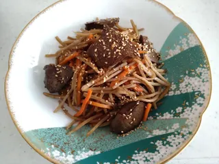 とりレバーを下処理しカットしてマヨネーズに漬け込みました 漬け込んだレバーは茹でて,酒、醤油、にんにくにあわせて置きます 市販のごぼうとにんじんを試用しました。ごま油で炒め砂糖、顆粒和風だし、味醂、醤油で味付けしレバーを戻して炒めて完成です 盛り付けたらいりごまをかけて