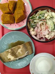 野菜サラダ、カレイの煮付けカボチャの煮物、ヨーグルトを今からいただきます(*^^*)まだ昼間は暑さが残るので、たくさん食べようと思います😊