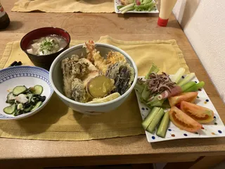 天丼です。わかめ、きゅうり、たこの酢味噌和え、味噌汁、サラダにイカのエンペラと生ハム、そしてマヨネーズです。