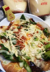 餃子の皮でピザ風ピザ🍕ピーマン、玉ねぎ、アスパラ、鮭フレークなどあったものでつくりました。パリパリ皮で薄いからパクパクいけるので食べ過ぎには注意が必要です😊ケチャップ、チーズ、マヨネーズの相性はバッチリです♪