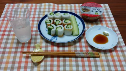 キュウリのちくわ巻き(大葉入り)いつもわさび醤油で頂きますが、マヨネーズ醤油(一味唐辛子入り)でも🆗 👍️ 🍶Ψ( ̄∇ ̄)Ψ ニホンシュ アイマス