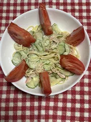 ツナとキュウリ🥒のパスタサラダ ツナとキュウリ🥒でパスタサラダを作りました。マヨ、レモン🍋汁、粒コショウを使いました。さっぱり頂けます❣️