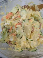 マスタードマヨでじゃがいも、ゴーヤ、玉ねぎ、ソーセージ、チーズと好きな物いっぱい入れたポテサラにしてみました。