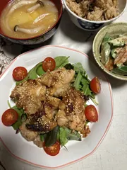 夕飯はヘルシーゴマ唐揚げ🍗 昨日の夕飯に揚げない鶏のゴマ唐揚げを作りました。ビニール袋に塩、コショウ、酒、しょうゆ、マヨを入れ、たれを作りそこにカットした鶏もも肉を投入。よく揉んで15分位置き片栗粉も揉み込みごまをまぶしてオーブンで焼きました。脂っこくなくて美味しく頂けます。小鉢はオクラとちくわを深煎りドレッシングで和えたもの